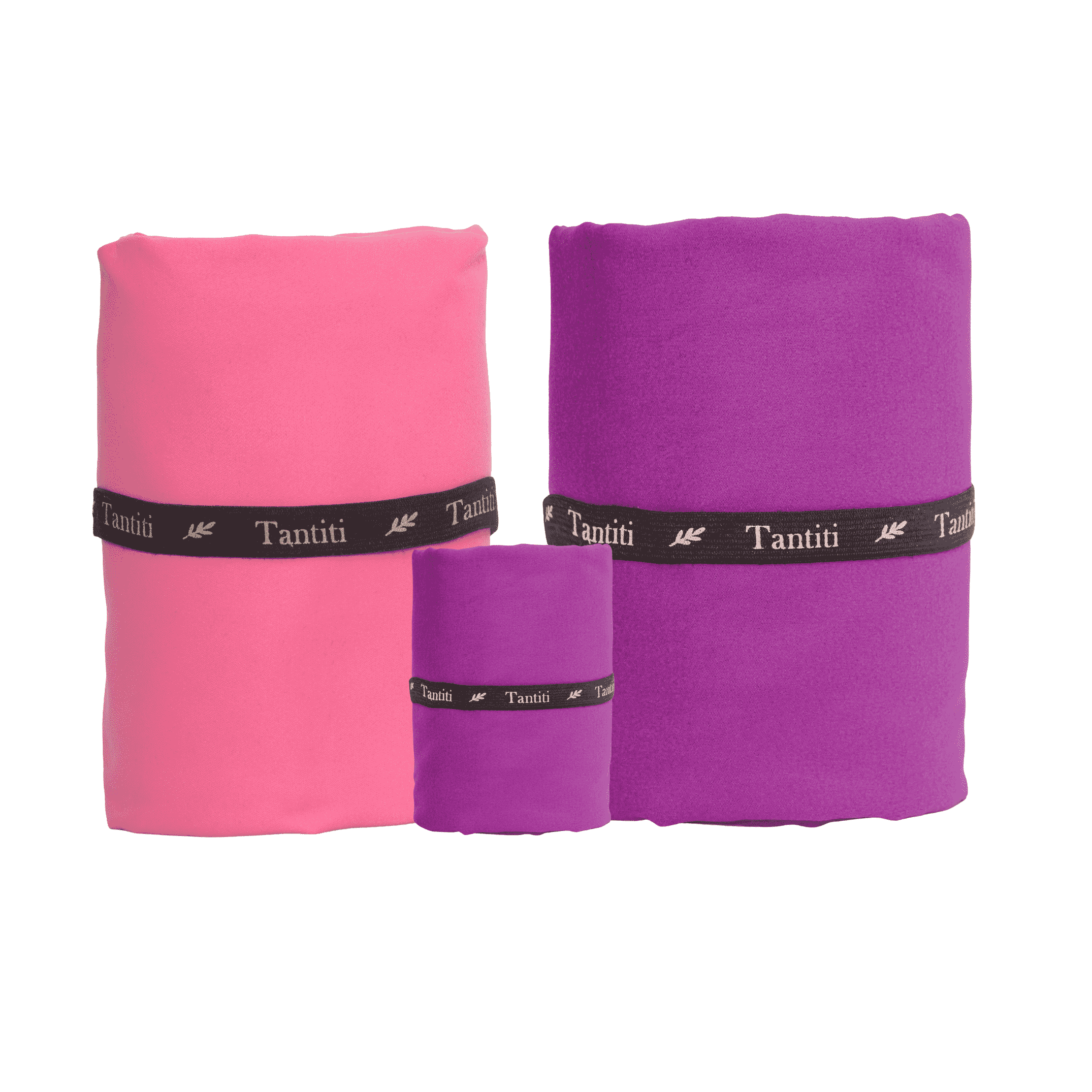 Dos toallas de playa morado y fucsia , y una toalla deportiva morada.